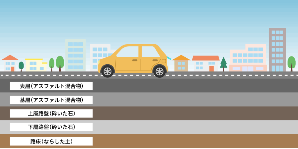 皆さんが普段使っている道路は、何種類もの材料が層になって重なってできています。